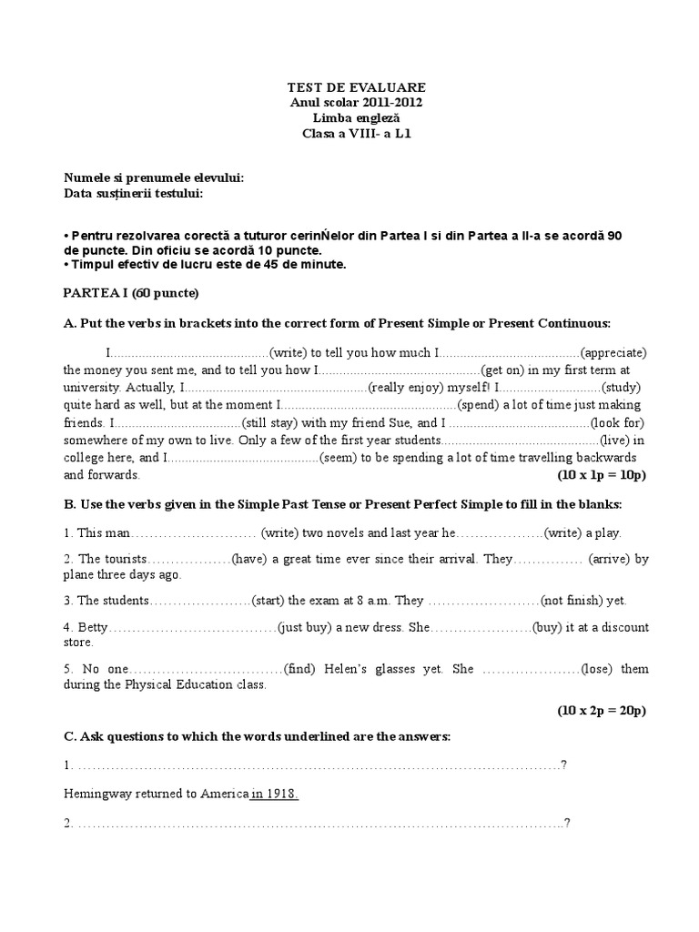 Limba Engleză Clasa A Iv A Teste Grammar Language Mechanics